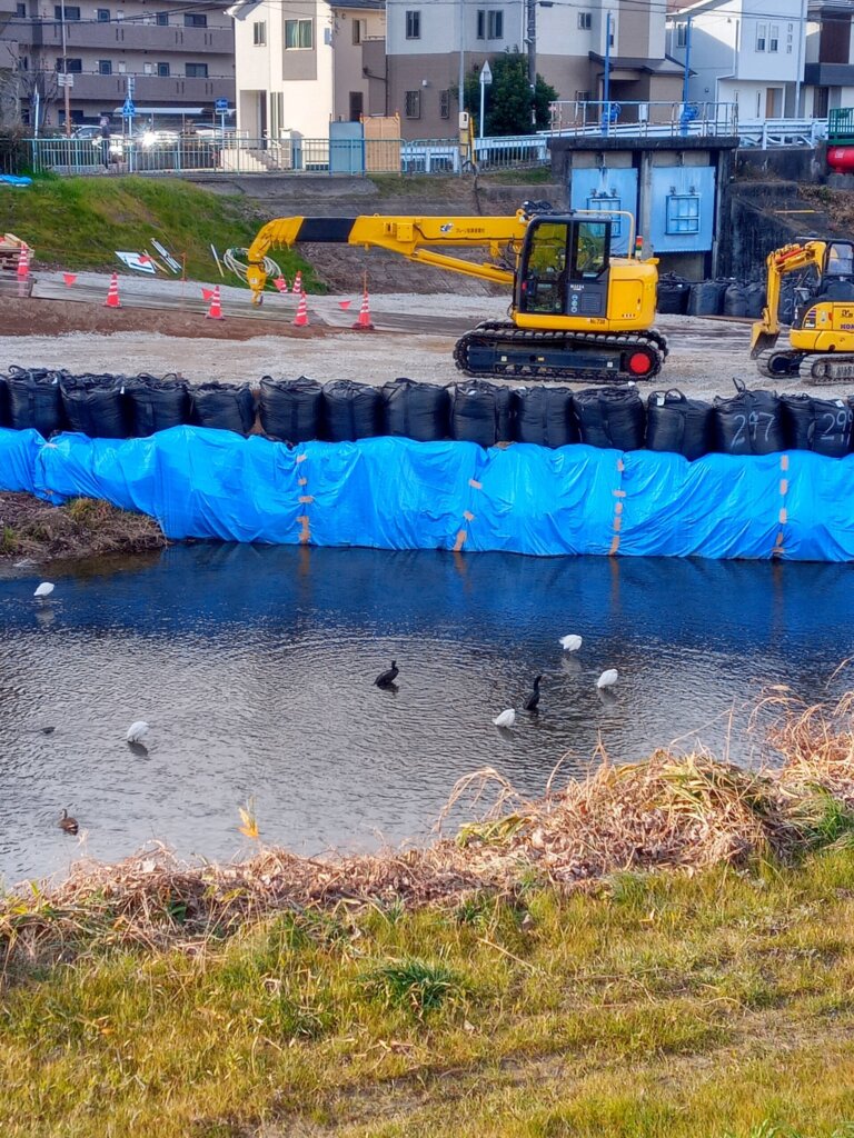工事中の護岸に並ぶ鳥たち。シロサギやカワウ、カモたちが思い思いの場所で佇んでいます。人間が作るブルーシートや重機といった人工的な景色の中でも、彼らは動じることなく、自分たちの時間を生きています。